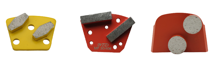 Generally diamond grinding shoes are used for grinding concrete and terrazzo floor, we make different metal bonds specificially for various hardness of floor. For example, extremely soft bond, extra soft bond, soft bond, medium bond, hard bond, extra hard bond, extremely hard bond. Some customers also use for grinding stone surface, we also can adjust the formular base on your request.