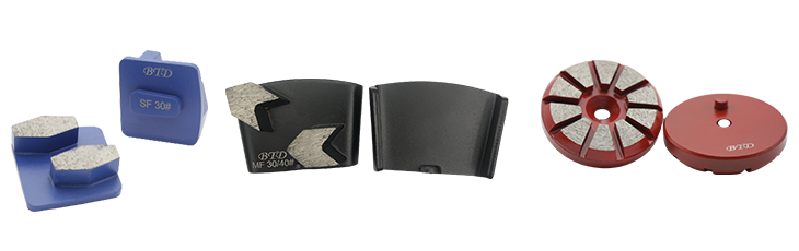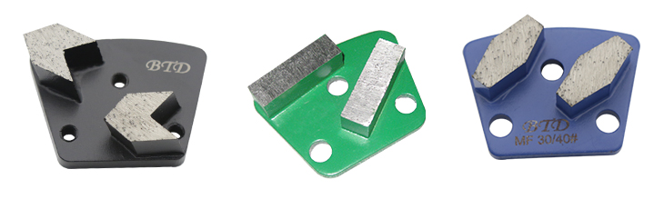we offer different segment shapes, such as arrow, rectangle, rhombus, hexagon, coffin, round etc, if you are for initial coarse grinding to faster opening the concrete surface or would like to remove epoxy, paint, glue, you prefer chose segments with angles like arrow, rhombus, rectangle segments, if you are for fine grinding, you can choose round, oval etc segments, which will leave less scratches on the surface after grinding.